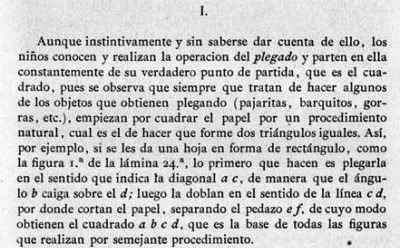 ********** Analysis El Plegado - Paper Folding Folds of Knowledge The opening paragraph says, roughly translated: 'Children instinctively ... know and perform the operation of folding and always begin from its true starting point, which is the square, since it is observed that whenever they try to make some of the objects they obtain by folding (pajaritas, boats, hats etc) they begin by squaring the paper.' The passage goes on to describe How to construct squares from an oblong.