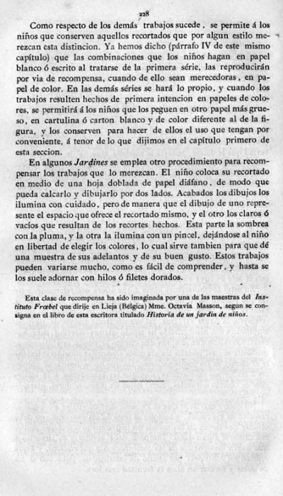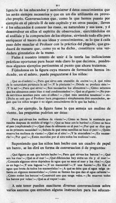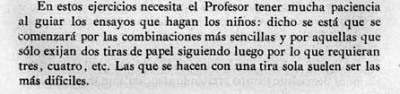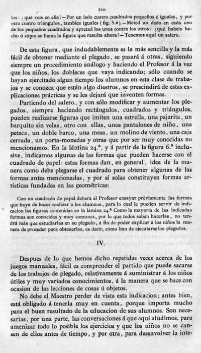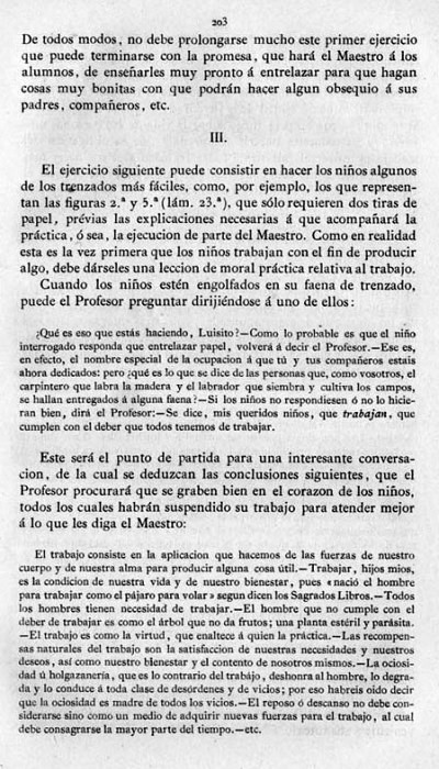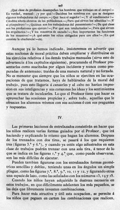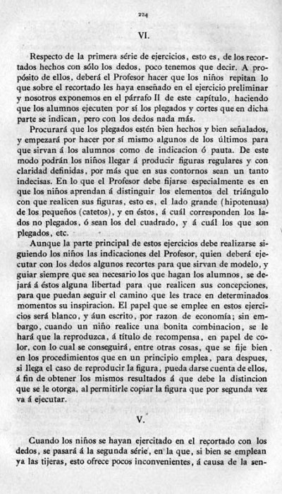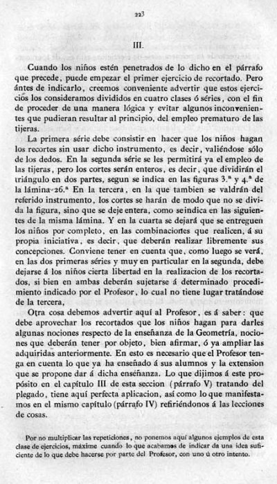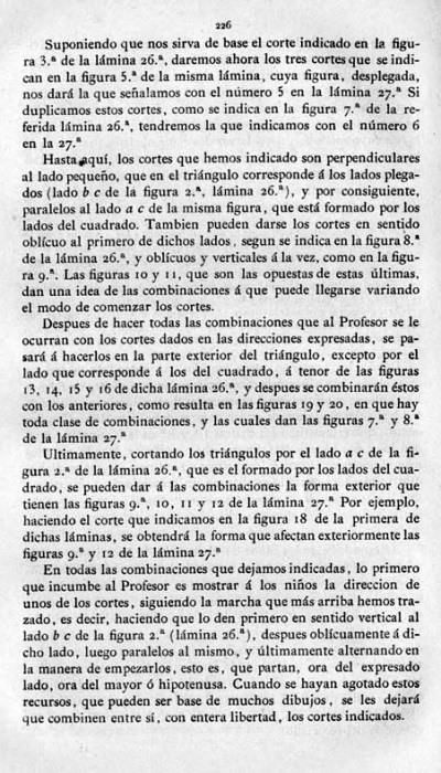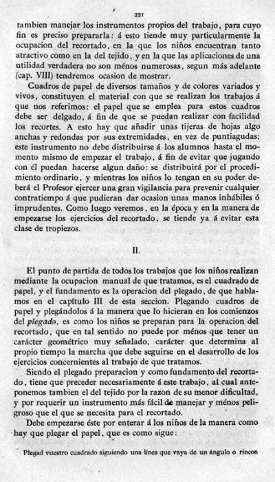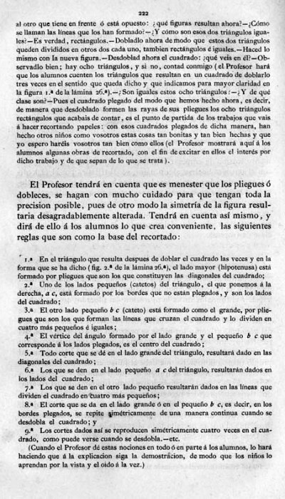 entry to meet the requirements of the rules). A full copy of the work can be accessed online here. Inter alia there are chapters devoted to the Froebelian occupations of El Trenzado o Entrelazado (Flechten and Verscnuren) , El Plegado (Falten) and El Recortado (Ausschneiden und Aufklaben). A full copy of the chapters relating to these occupations is included at the foot of this page. While the author relies heavily on material drawn from previous works such as those by Jacobs and Delon he criticises their belief that paperfolding is a useful way to teach mathematical concepts to young children. **********