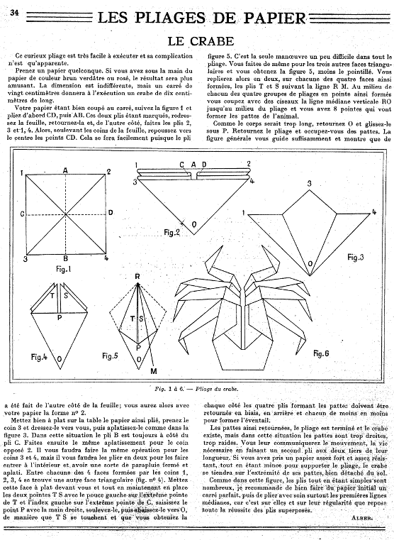 information that should be added. Thank you. ********** 1900 As far as I know diagrams for this crab appear in an article by Alber in the French children's magazine Mon Journal of 8th December 1900. The introduction states, roughly, 'Today we continue our Japanese folds, and we are going to show you how to make a crab. Madame Kawada, of whom I have already spoken, with a paper four centimetres square can easily make a tiny one centimetre crab; it is enough to tell you that, with a little patience, and by taking a sufficiently large paper you will arrive at a good result.'