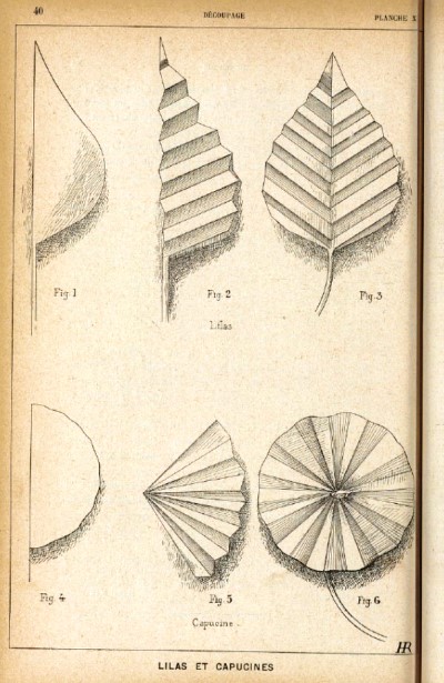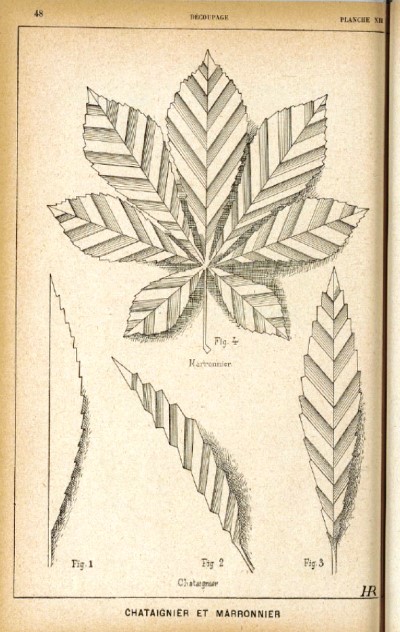 This page is being used to collect information about the history of folded paper leaves. Please contact me if you know any of this information is incorrect or if you have any other information that should be added. Thank you. ********** 1889 A series of designs for paper leaves appears in 'Jeux et Travaux Enfantins - Première partie: Le Monde en Papier' by Marie Koenig and Albert Durand, which was published by Librairie Classique A. Jeande in Paris in 1889. This method of cutting out then zigzag folding to create indentations around the edges is said to be a discovery of the author's.