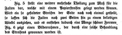 ********** 1873 A Pull-Out Picture Frame is explained in 'Die Praxis Des Kindergartens' by August Koehler, which was published by Herman Bohlau in Weimar in 1873. The text says that by preparing a strip as shown, then folding it in half lengthways, the corners can be pulled out to create various forms including a picture frame.