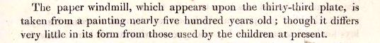 ********** 1844 There is mention of a paper windmill on page 83 of 'The Mottoes and Commentaries of Friedrich Froebel's Mother Play', published by D Appleton and Company, New York in 1895, which is a rendering into English of a work by Froebel first published in German in 1844. The English text contains the sentence 'Hearing the sound, out runs a little boy with his paper windmill. It turns faster and faster as he increases his speed.' It is not clear which type of paper windmill Froebel is referring to here. ********** The Fold and Cut Paper Windmill - 1853 onwards
