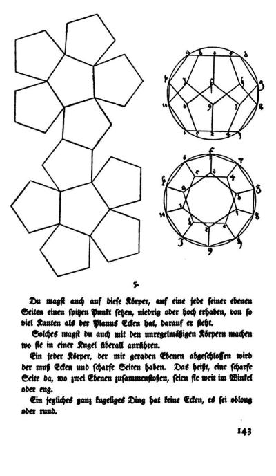 ********** 1510 Charles de Bovelles (variously also known as Carolus or Bovillus) book 'Libellus de Matematicis Corporibus', published in 1510, included drawings of polyhedral nets for an icosahedron ( in three parts) and a fifteen sided solid constructed by adding pyramids to the pentagonal faces of a pentagonal prism. (Information from 'A History of Folding in Mathematics by Michael Freedman, published by Birkhauser in 2018.) I been not able to verify this information. ********** 1525 The fourth book of Albrecht Durer's 'Unterweisung der Messung', published in 1525, contained foldable polyhedral nets for the five platonic solids, the truncated tetrahedron, the cuboctahedron, the truncated octahedron, the truncated cube, the rhombicuboctahedron, the truncated cuboctahedron, the snub cube and an eighteen sided solid made by adding pyramids to both hexagonal faces of a hexagonal prism.