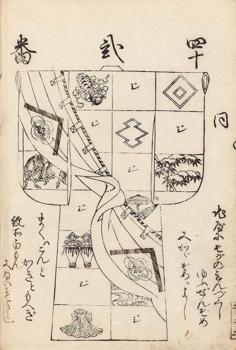 ********** Similar folded decorations appear: 1713 In a print from 'Shôtoku hinagata' (Patterns from the Shôtoku Era) aka Shotoku 3 by Nishikawa Sukenobu, which was published in 1713