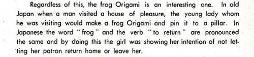 See 'Japanisches Geschlechtsleben' by Tamio Satow, which was published in Leipzig in 1931. *** In the Preface to his 'All About Origami', which was published by Toto Bunka Company, Limited in Tokyo in 1960, Isao Honda writes: