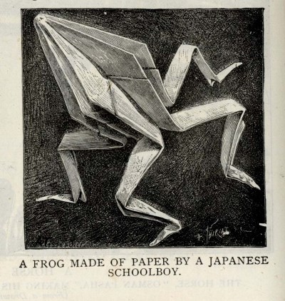 ********** In Europe and the Americas 1889 As far as I know the earliest publication of diagrams for the Inflatable Frog appeared in 'La Nature' of 28th September 1889 in an article headed 'Recreation Scientifiques' and subheaded 'La Grenouille Japonaise en Papier' (The Japanese Paper Frog). The article is attributed to Dr Z. I do not know who used this nom de plume. The article is interesting not only for the diagrams it contains but also for the incidental information it provides. In his introductory paragraphs Dr Z states, roughly, 'The Ministry of Public Education of Japan has sent to the Exhibition (ie presumably the Paris Exposition of 1889) an interesting series of industrial and artistic designs ... made by children of both sexes in the country's school rooms ... but one can notice others which are not less curious. These are the recreational works done by the small children of the Azabu private school in Tokyo. The series of displays showing cut out and coloured papers combined to make flowers, butterflies or marquetry designs are quite attractive and our children would probably be happy to know how to make such pretty things. In France, it is true, we also know the charming game of folding paper. The classic Cocotte, the box and the galiote etc., are popular here but we must agree that the Japanese have more ingenious models. The Frog that we put in front of our young readers is an example. It is thanks to MM, the commissioner of Japan, that we have been able to trace the figures necessary for its execution'. At the end Dr Z adds, again roughly, 'La Nature has previously given another example of the Japanese game of paperfolding, which was how to make the paper bird (ie the Flapping Bird). We also noticed in the exhibition other designs among which were the crab from red paper, the junk and the hat of Daimios (demon), the parrot etc., The way these designs are made has many points of resemblance to the Frog.' Dr Z does not appear to be aware that this frog can be inflated.