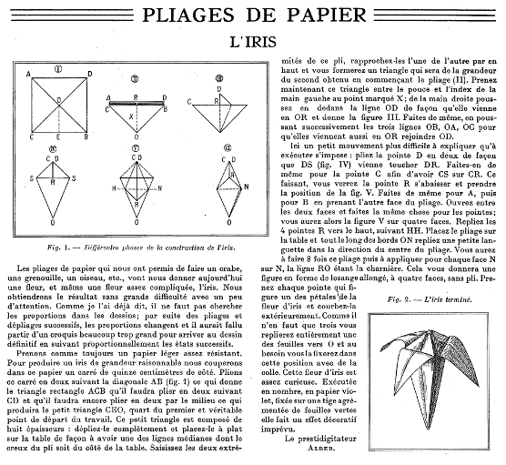 ********** In Europe and the Americas 1901 A three-petalled design, called 'Fleur d'Iris' and folded from a square, appears in an article by Alber in the French children's magazine Mon Journal of 27th July 1901. The introduction says, roughly, 'I have already had the opportunity to teach you how to make a number of paperfolds, and I told you that most of these folds, absolutely unknown in France, but very familiar to young Japanese, had been communicated to us by Mlle Kavada. You will certainly be pleased to learn that Mlle Kavada has obtained for you from her friends in Japan a whole new, very curious, series which will be published in Mon Journal; today I want to show you how to make an Iris flower.'