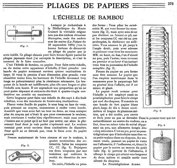 ********** 1931 In 'La Nature' Issue 2853 of 15th March 1931 in an article by Albers headed 'Pliages de papier' and subheaded 'L'echelle de bambou'. The introduction states, roughly, 'When I looked at the Library of the Guimet Museum for the true origin, not of the cut-out Chinese shadows, but of the shadows with my hands (La Nature du 29 Septembre 1894) I had the good fortune to discover a folding of paper that was unpublished. This Chinese folding can do well among the Japanese folding ...'