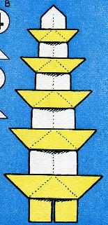 ********** In Europe and the Americas 1928 As far as I know the first appearance of the Pagoda in the historical record is in 'Fun with Paper Folding' by William D Murray and Francis J Rigney first published by the Fleming H Revell Company, New York in 1928. It is made from 5 pieces folded from squares of diminishing sizes, each square being a half inch smaller than the preceeding square.