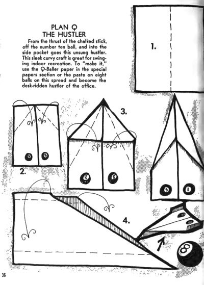 ********** 1966 As 'The Hustler' in 'The Executive Manual on the Construction of Paper Projectiles' by Rik Olson, which was published by The Pisani Press in San Francisco in 1966. Note that this version of the Paper Dart has been given side stabilisers.
