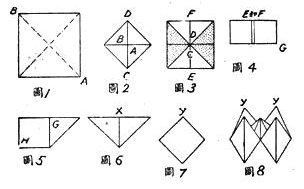 ********** 1959 In their 1959 book 'Lore and Language of Schoolchildren' folklorists Iona & Peter Opie mention the use of a salt cellar as a "Film Star Oracle". 'A sheet of clean paper about seven inches square (usually torn from an exercise book), is folded diagonally both ways to mark the centre and flattened out again. Each corner is folded into the centre and the whole paper is then turned over and laid on its face, and the four new corners are folded into the centre to make a 3 l/2-inch square. The paper is next turned face uppermost again and the names of four or more film stars are inscribed across each of the four squares which have been made, while the name of a flower is written in each of the eight triangles which have been formed on the back of the oracle. It is then opened by lifting up each of the four flaps and eight predictions . . . are written in each of the triangles corresponding to the names written on the other side. The corners are then folded back again to the centre. Next the paper is folded in half and in half again, to make a 1 3/4 inch square. This is then slightly opened out with the points held uppermost and the first finger and thumb of each hand are inserted into pockets, under the flaps which bear the film stars' names ...' ********** The design also appears: 1959 As 'Salt Dish' in 'Fun-time Paper Folding' by Elinor Tripato Massoglio, which was published by Childrens Press in Chicago in 1959. The designs in this book are said to have been learned in Japan.