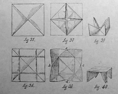 ********** In Europe and the Americas 1848 'Die Kindergärten' by Wilhelm Middendorf was published by Verlagsbuchhandlung der Kindheit und Jugendbeschäftigungsanstadt in Blankenberg and Rudolfstadt in 1848. It contains a description of children folding Lebensformen which mentions a 'Tisch' which, in the context can be identified as The Table. ********** 1859 A design titled 'La table' appears in a list of designs in the 'Manuel Pratique de Jardins D'Enfants de Friedrich Froebel, which was compiled by J F Jacobs and published in Brussells and Paris in 1859. ********** 1861 A design titled 'ein Tisch' (a table) appears in a list of designs in 'Das Paradies der Kindheit' (The Paradise of Childhood) by Lina Morgenstern, which was published in Leipzig in 1861. There are no accompanying illustrations. ********** 1863 The earliest known illustration of this design is found, as 'De tafel' (the table) in 'De Kleine Papierwerkers 1: Wat men van een stukje papier al maken kan: Het vouwen' (The Small Paperwork 1: What one can make from a piece of paper: Folding) by Elise Van Calcar, which was published by K H Schadd in Amsterdam in 1863.
