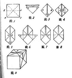This page is beng used to collect information about the history of the paperfolding design known as The Waterbomb, The Balloon etc. Please contact me if you know any of this information is incorrect or if you have any other important information that should be added. Thank you. The name 'Waterbomb' refers to the use of this design as a water bomb in the playground by school children, but it can also be used to produce smoke rings (in a way similar to the Playing Card Cube), or as a prison for flies (whose buzzing is amplified by the container), fireflies (thus becoming a lantern), or other insects, and in other inventive ways. There is a separate page for The Hot Air Balloon variant. ********** In China (and in publications by Chinese authors) 1914 Diagrams for a 'Firefly Box' appear in 'Zhe zhi tu shuo' (Illustrated Paperfolding), compiled by Gui Shaolie, which was published by the Commercial Press in Shanghai in Ming guo 3 (1914).