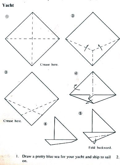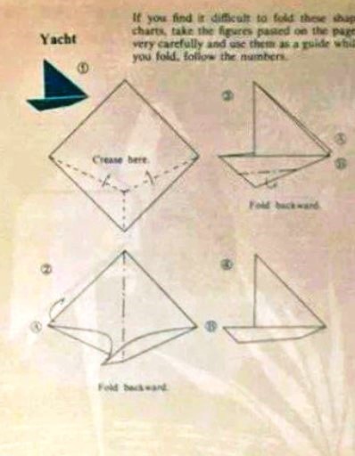 ********** 1964 Two versions of the Yacht appear in 'Secrets of Origami', by Robert Harbin, which was published by Oldbourne Book Company in London in 1964. The design is said to be Japanese.