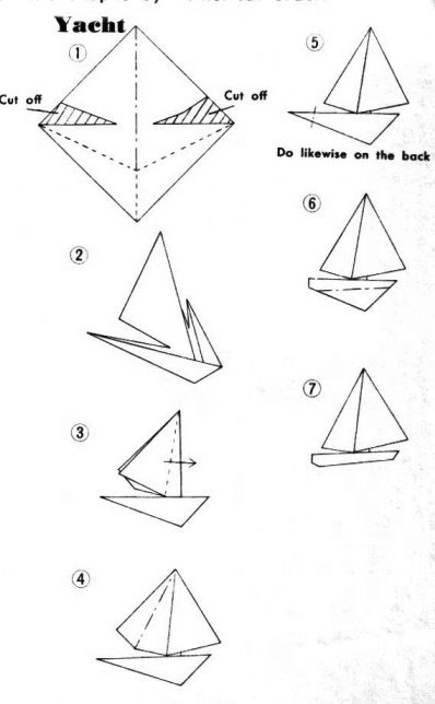 ********** As 'Yacht' in 'Origami Fun Book: Crane Book' by Tatsuo Miyawaki, which was published by Shikoku Hoiku Co Ltd in Matsuyama, Japan in 1965.