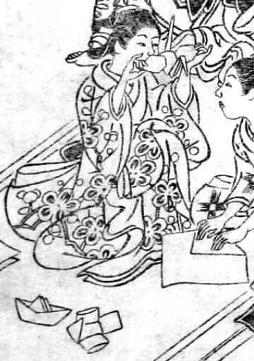 'Onna fuhzoku tama kagami' by Nishikawa Sukenobu was published in two parts, an upper and a lower, in 1732. The upper contains several prints featuring paperfolding content. A full copy of both parts of the work is available online here. ********** The subject of this print is the Hina Doll Festival. The ladies (or perhaps children) on the left are folding paper. One is inflating a Paper Crane. There are also a completed Komoso and Paper Boat (the version with three sails) lying on the floor. The print also shows paper sake container decorations.