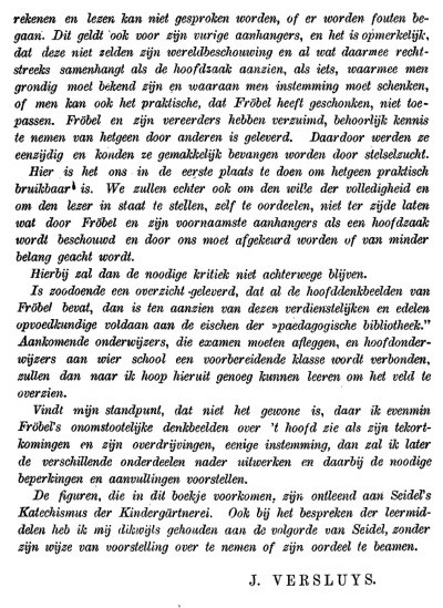 'Paedagogische Bibliotheek VI: Frobel' by J Versluys was published by W Versluys in Groningen in 1879. This work is an overview of Froebel's theory and teaching methods. The illustrations are taken from 'Katechismus der praktischen Kindergärtnerei' by Friedrich Seidel. While the text is largely based on the text of the earlier work it includes substantial interpolations by the author and it seems safer to treat it as an entirely new book and provide a full Analysis.