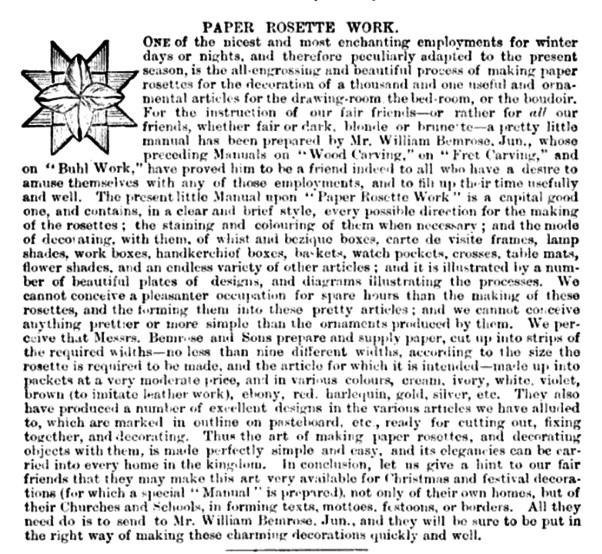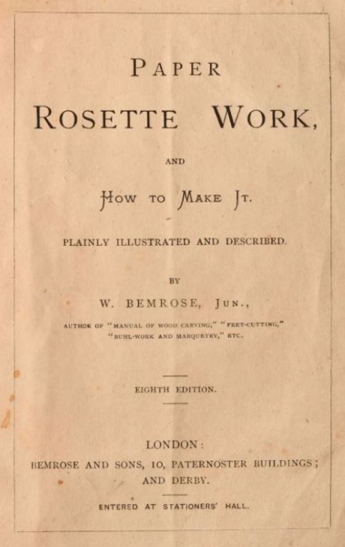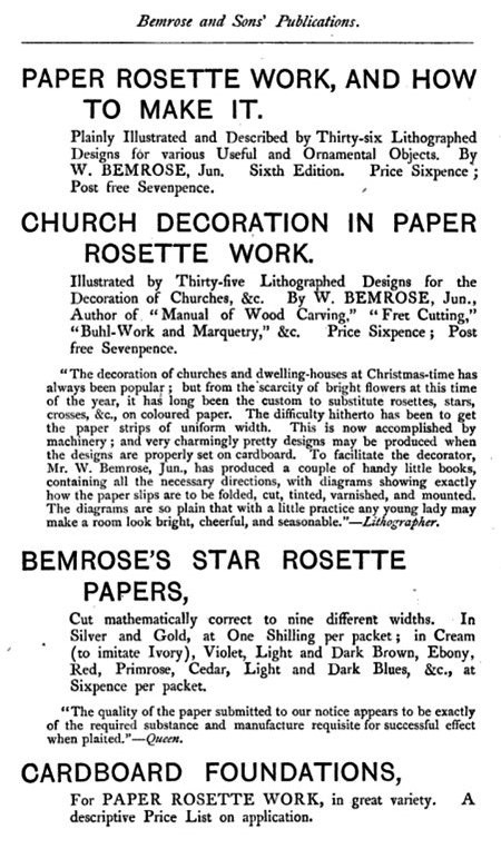 'Paper Rosette Work and How to Make It' by William Bemrose was published by Bemrose and Sons in London and Derby in 1872. I have not seen a full copy of this work. The date of publication is attested in an article / advert in 'The Reliquary' for October 1872, an archaeological journal also published by Bemrose and Sons (see here). The article states that Bemrose and Sons also supply precut strips folding rosettes.