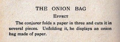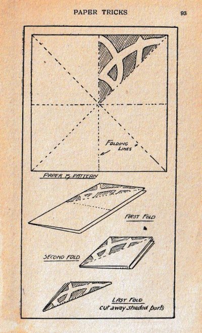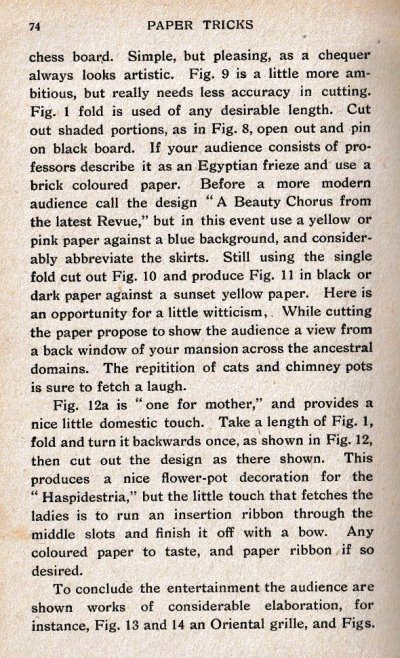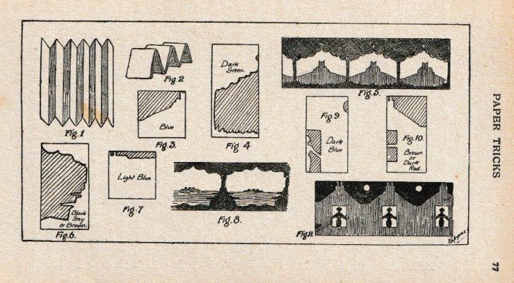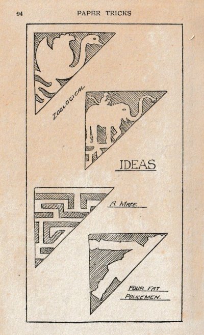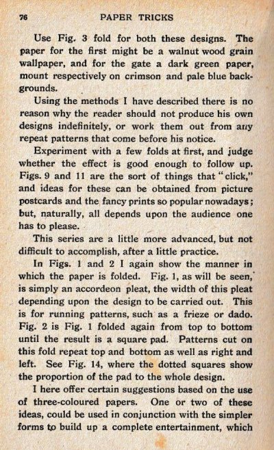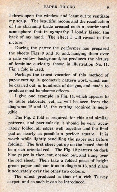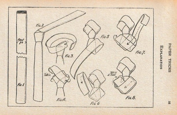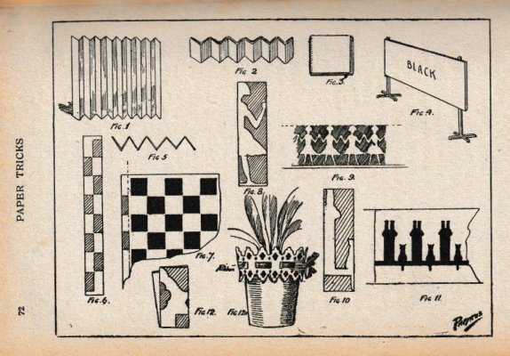 'Paper Tricks' by Will Goldstone was published in London by Will Goldston Limited. The work is undated but is believed to have first appeared in 1919 (see below). The work contains various stunts and magical effects using paper. Those few that make substantive use of folding (and mostly also of cuts) are detailed below. A novel element of this work is that many of the designs are made from several superimposed sheets of torn or cut paper to enhance their visual effect. ********** This work is mentioned in Gershon Legman's 'Bibliography of Paperfolding' which was published in 1952.