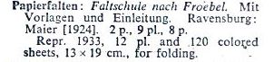 'Papierfalten: Faltschule nach Frobel' was published by Otto Maier in Ravensburg in 1924. I have not seen a copy of this work. There is a Bibliographic entry about this work here. ********** This work is mentioned in Gershon Legman's 'Bibliography of Paperfolding' which was published in 1952.