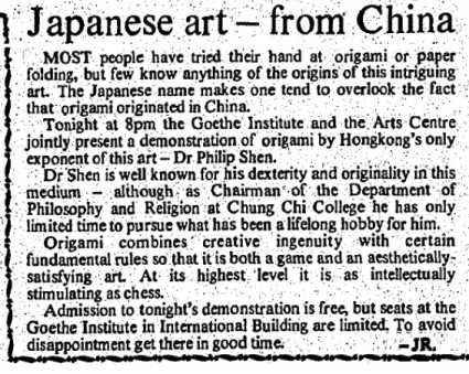 ********** 1966 Volume 6, Issue 3 of 'The Origamian' for Autumn 1966 contains a letter from Philip Shen saying he is too busy with his university duties in Hong Kong to have much time for paperfolding. ********** 1973 This advertisement for a talk by Philip Shen appeared in the South China Morning Post for 6th November 1973.