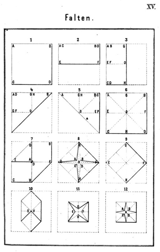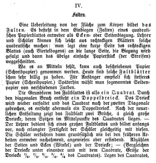 'Praktischer Wegweiser fur den Unterricht in der Elementarklasse' (Practical Guide for Teaching in the Elementary Class) by Anton Fruhwirth, Alois Fellner and Georg Ernst was first published by A Pichler's Witwe & Sohn in Vienna in 1872. (See here.) I have not been able to access a copy of this first edition. This page is based on the 2nd edition, published in 1875, which contains a brief section on Falten and two accompanying plates of illustrations of paperfolds. The pictures in these plates appear to have been extracted from plates that had previously appeared in the 1974 edition of 'Der Kindergarten' by Hermann Goldammer. The Preface to the 2nd edition states, inter alia, roughly translated: 'In the second edition the elementary class is covered and presented in its entirety and with regard to its important task. One chapter is devoted to Formenarbeiten, both theoretically and practically, and several other chapters ...' I take this to mean that the chapter on Formenarbeiten, which includes the section on Falten, is new and did not appear in the first edition. A full copy of the second edition can be accessed online here. **********