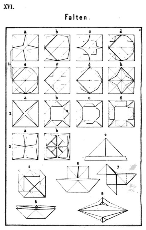 ********** Analysis The Preface states that folding is done from squares and explains how to obtain them individually from oblongs. For beginners stiff paper (writing paper) is recommended but 'Later tissue paper in various colours is preferred.' ********** Plate XV shows the basic Erkenntisformen folds, which are explained in detail in the text, and how to create the Double Blintz Basic Form, which is not mentioned. ********** Plate XVI shows a number of Schonheitsformen. These again are not mentioned in the text. Forms 1a to 1h are developed from one side of the Double Blintz Basic Form and forms 2a to 2d from the other. Forms 3a and 3b are developed from the Windmill Base, which is not mentioned or explained. ********** Pictures 4 to 9 show various unnamed Folds of Life, which again are not specifically mentioned or explained, although the text says: 'By continuously folding the pages open and closed ... the most diverse forms of life are created (trousers, jacket, ship, pepper and salt cellar, piglet). The folding work is also ideal for homework.' Pictures 4 to 9 show: 4. The Newspaper Hat