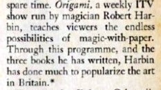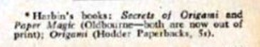 The USA version of Reader's Digest magazine of August 1970 published an article entitled 'Paper Magic of Origami' which was 'condensed' from a similar article in 'Beacon Magazine of Hawaii'. In October 1970 a similar article was published in the UK version, which, according to the front cover, had a circulation of over 1.5 million copies. My thanks to Wayne Brown for sharing his copy of this article with me. Unlike the original, this version of the article includes diagrams for 'Yoshizawa's Flapping Dove' taken from 'Simple Origami' by Eric Kenneway, which had been published earlier in 1970. The text also contains an additional paragraph about Robert Harbin and reference right at the end to his books 'Paper Magic, 'Secrets of Origami' and 'Origami' (better known as Origami 1).