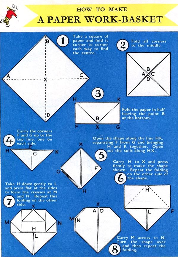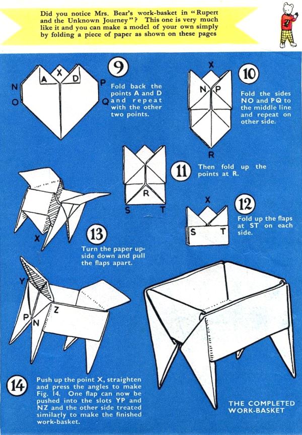 'Rupert' was published by The Daily Express in 1955. It contains: A story titled 'Rupert and Poll Parrot' and accompanying folding instructions 'How to make a Cat's Head' (The Wild Man from Borneo). A story titled 'Rupert and the Unknown Journey' and accompanying folding instructions 'How to make a Paper work-Basket' (The Sanbo on Legs). **********