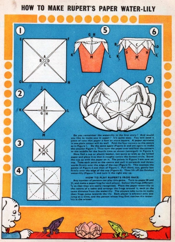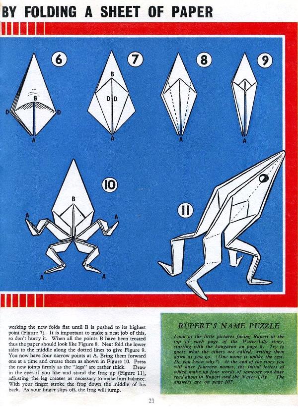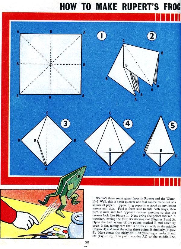 'Rupert' was pubvlished by The Daily Express in 1958. It contains a storey 'Rupert and the Water Lily' and two sets of folding instructions for designs mentioned in the story, 'How to Make Rupert's Paper Water Lily' (The Lotus) and 'How to Make Rupert's Frog by Folding a Sheet of Paper' (The Inflatable Frog), although in this case the design is treated as a jumping frog and there is no mention that it can be inflated. **********
