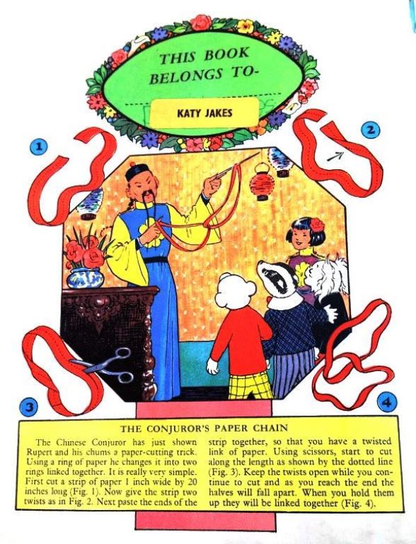 'Rupert' was published by The Daily Express in 1961. It contains a frontispiece explaining 'The Conjuror's Paper Chain' (The Afghan Bands). It also contains a story 'Rupert and the Hearth Rug' and a section tited 'How to Make Rupert's Hearth Rug' of which I have not managed to locate details. This 'hearth rug' may, or may not, be a paperfolding design. **********