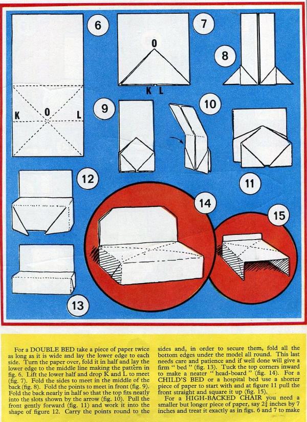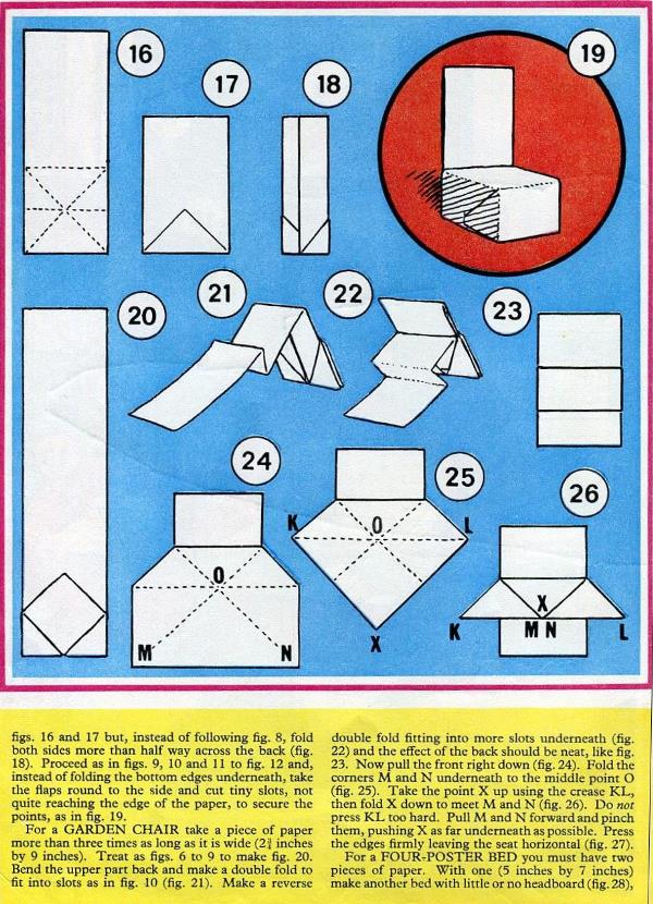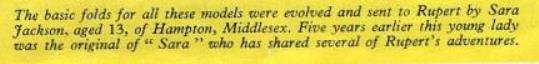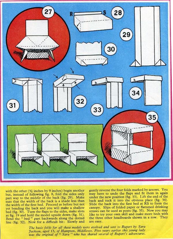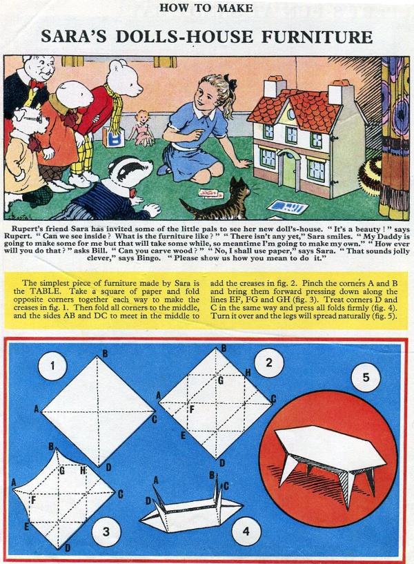 'Rupert' was published by The Daily Express in 1966. It contains folding instructions titled 'How to make Sara's Dolls-House Furniture', which, unusually, are not connected with one particulare story within the work but have a more general connection to several other Rupert stories featuring 'Rupert's friend Sara' as explained here: