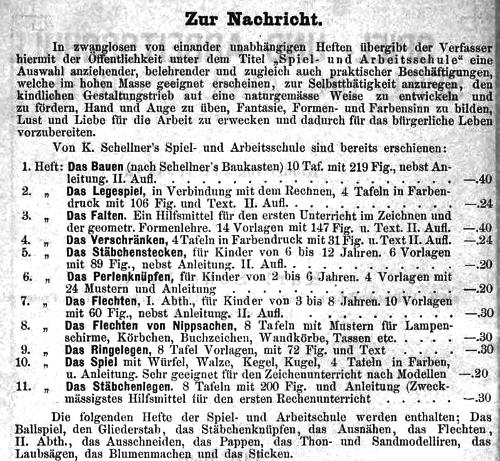 'Spiel und Arbeitschule, Volume 3 - Falten' by Karl Schneller is known from a list of volumes published in volume 10 here. The date of publication is unknown. but since later volumes in the series were published in 1882 and 1883 it seems reasonable to assign it to 1882 pending better information. I have not a seen a copy of this work. The list (see below) states that it is 'An aid for initial instruction in drawing and geometric form theory' with '14 templates with 147 figures and text'. **********