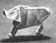 ********** Unamuno's Pig (Cerdo) 1922 A description of how the Cerdo came to be invented can be found in 'Varaciones' by Ramon Gomez de la Serna, which was published in 1922. The design is not illustrated in this article. The passage about the pig, found on page 192, reads, roughly, 'This little pig was invented by me, and under extraordinary circumstances. Between a friend of mine, today a professor and an excellent cocotte scientist, and I, we set ourselves the problem of building a quadruped. Only four extremities emerge from the fundamental fold, which serve for a bird with two legs, beak and tail; but for the quadruped it was necessary to get six: four legs, head and tail. My friend investigated empirically, atrociously, tearing up papers, and did not succeed. I went to bed ... In the morning, when I got up, I took a paper, and the first time what you see came out; and I tell you in all seriousness that it takes much more imagination and acuity than to write a poem and ... much more than preparing a speech ... to provoke a ministerial crisis.' ********** 1925 A drawing of the pig design appears in an article titled 'Cocotologia' which was published in 'Plus Ultra' in December 1925.
