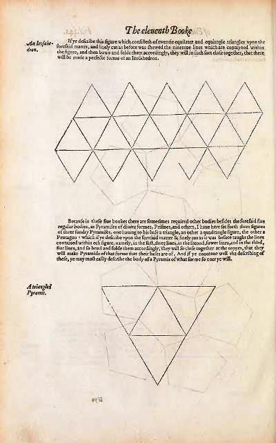 'The Elements of Geometrie' by Henry Billingsley, published by John Daye in London in 1570, is a translation of Euclid's 'Elements' into English with additional material added. Book 11 has been enhanced by the addition of 60 foldable paper models illustrating the text which are glued to the pages and can be raised into position when the pages are opened. There are also illustrations of several foldable polyhedral nets. See examples below. A full copy of the work can be accessed online here. **********