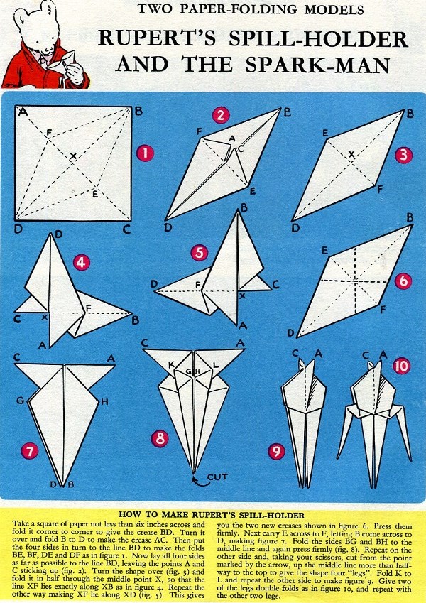 'The Rupert Book' was published by The daily Express in 1956. It contains folding instructions for two related designs 'The Spill Holder' and 'The Spark Man' which appear in the story 'Rupert and the Blue Moon'(although the spill holder is ceramic not paper). Neither of these designs are known from any other source so they are probably inventions of Alfred Bestall. **********