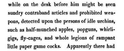The 'popguns' are presumably the 'prohibited weapons', leaving the 'whirligigs', 'fly-cages' and 'rampant little game-cocks' as 'sundry contraband items'. Why these items should have been considered contraband is not clear (but see below). 'Rampant little game-cocks' sounds like a description of folded paper Cocottes. 'Whirligigs' is a term commonly used for any rotating device. If these were also made of paper then they could have been Cut and Fold Windmills or some sort of rotor that was thrown into the air and spun on the way down. There is, however, no specific evidence for the existence of either of these at this early date. If the 'Fly-cages' were folded from paper then they were most probably Waterbombs, although again there is no specific evidence for the existence of the design at this early date. If they were folded from paper then they may have been considered as 'contraband' because the paper should have been used for other, more educational, purposes. Although the work was published in the USA, it was written in England where the author was living at the time, and is therefore, perhaps, more likely to be a description of something the author has seen in England rather than in the USA. A full copy of the work can be accessed online here. **********