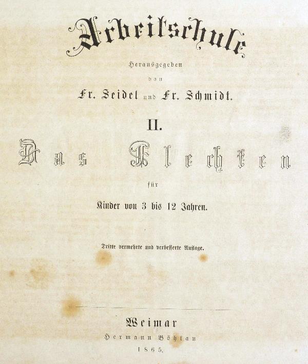 'Arbeitschule Volume 2: Das Flechten: für Kinder von 3 bis 12 Jahren' by Seidel and Schmidt was published by Hermann Bohlau in Weimar. Details of the various versions sold (ie with and without the inclusion of materials) are given in an entry in the Bibliography of the 1874 edition of 'Der Kindergarten in seinen Wesen dargestellt' by August Koehler: