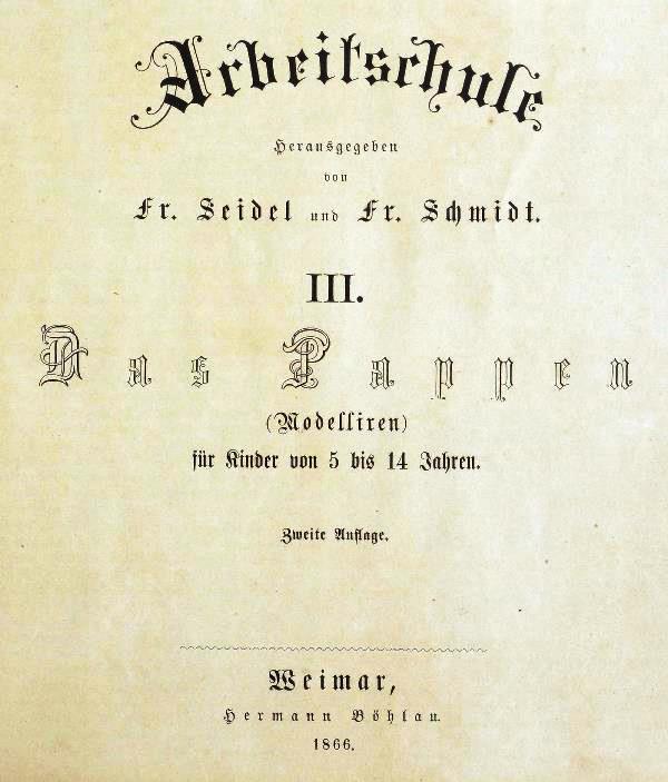 'Arbeitschule Volume 3: Das Pappen: für Kinder von 5 bis 14 Jahren' by Seidel and Schmidt was published by Hermann Bohlau in Weimar in 1866. A full copy of the work can be accessed online here. Further information will be added as time allows. **********