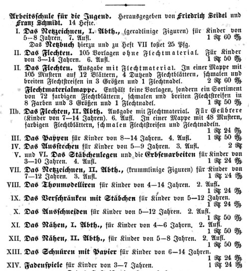 This page provides an overview of the series of booklets by Seidel and Schmidt published by Hermann Bohlau in Weimar under the title of 'Arbeitschule' from 1865 onwards. An entry in the Bibliography of the 1874 edition of 'Der Kindergarten in seinen Wesen dargestellt' by August Koehler (shown below) gives what is probably a full list of the titles, although there are some discrepancies between the numbers of the volumes found in this list and elsewhere in the literature. Four of the volumes relate to paperfolding occupations, each of which has its own Source Page, as follows: Arbeitschule Volume 2: Das Flechten by Seidel and Schmidt, 1865 Arbeitschule Volume 3: Das Pappen by Seidel and Schmidt, 1866 Arbeitschule Volume 10: Ausschneiden by Seidel and Schmidt, c1866 Arbeitschule Volume 13: Das Schuren mit Papier by Seidel and Schmidt, c1866 There is no volume about Falten. **********