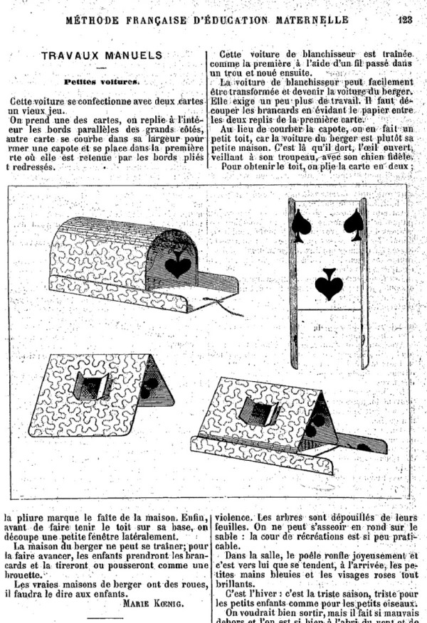 This article explains how to make the Voiture de Cartes and the Shepherd's Hut. The content of this article also appeared in 'Travaux Recreatifs Pour les Enfants de 4 a 10 Ans' by Marie Koenig, which was published by Librairie Hachette et Cie in Paris in 1898. My grateful thanks for Michel Grand for drawing this article to my attention. **********