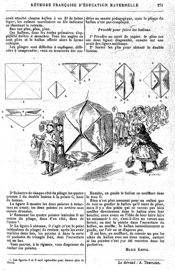 This article expalins how to make The Waterbomb. The text suggests using a paper cone to help young children inflate it and also the possibility that young children need not tuck the flaps inside the pockets. It is also worth noting that the writer refers to the upside down waterbomb base (fig 2) as 'le double bateau' (the double boat). The same information appears in 'Travaux Recreatifs Pour les Enfants de 4 a 10 Ans' by Marie Koenig, which was published by Librairie Hachette et Cie in Paris in 1898. My grateful thanks for Michel Grand for drawing this article to my attention. **********