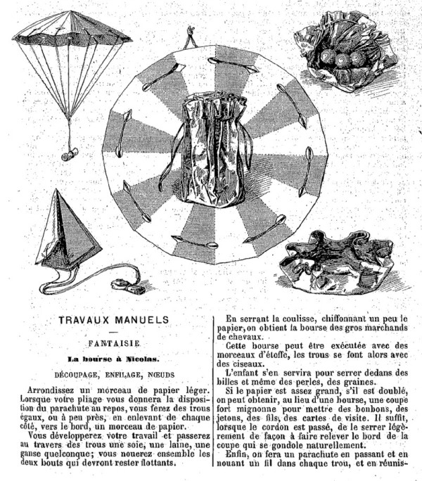 This article explains how to make The Parachute and La Bourse a Nicolas - a drawstring bag or 'purse of wealthy horse traders'. The same information appears in 'Travaux Recreatifs Pour les Enfants de 4 a 10 Ans' by Marie Koenig, which was published by Librairie Hachette et Cie in Paris in 1898. My grateful thanks for Michel Grand for drawing this article to my attention. **********