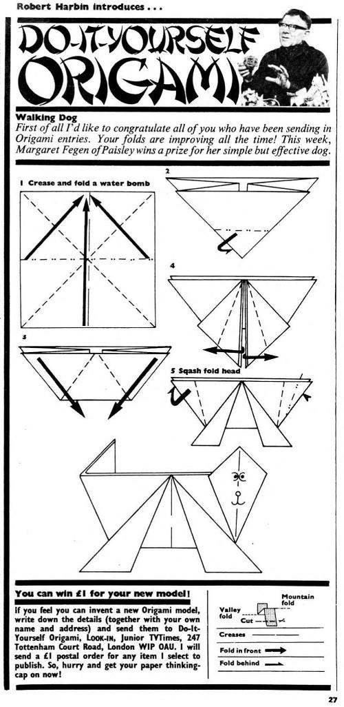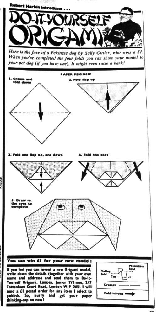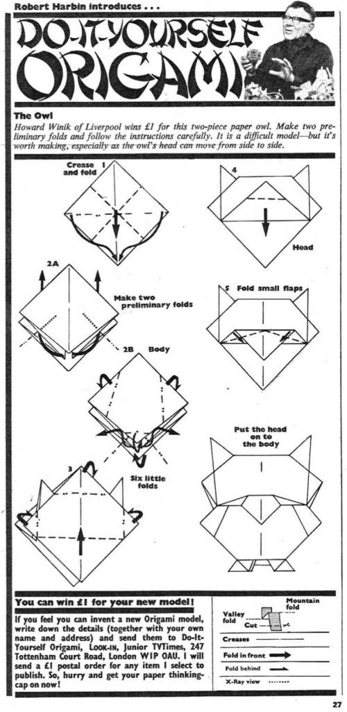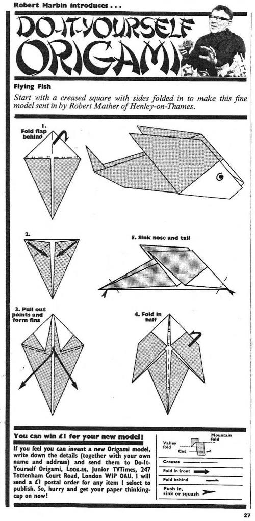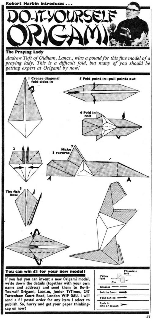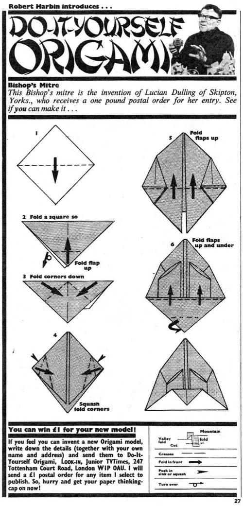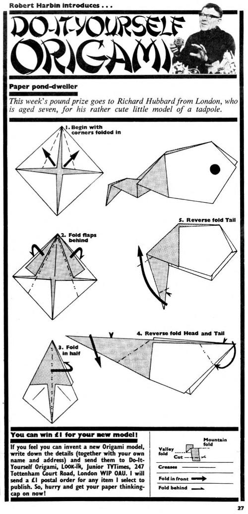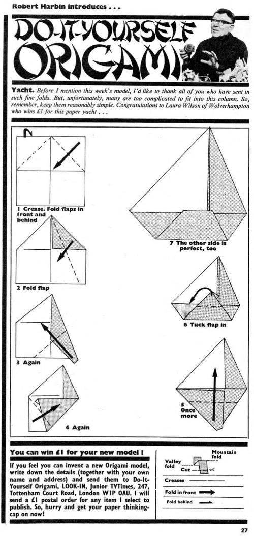 Robert Harbin contributed a series of articles featuring origami designs to ITV's 'Look In' magazine from 1971 onwards. This was a spin-off from his 'Origami' TV program. 'Look In' was first published early in 1971 but I do not know when the first of Harbin's articles appeared, or, indeed, how long they continued to appear for. Many of the designs were sent in by readers, for which they received the princely sum of £1 by Postal Order (as well, of course, as undying fame). Some of these designs were collected together in Harbin's book 'Have Fun with Origami which was published by Severn House in 1975. Thiose few articles I have managed to locate are shown below. ********** From Vol 2 Issue 3 of 15th January 1972 My thanks to Edwin Corrie for providing this one.