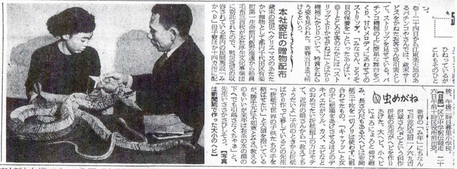 Yoshizawa for the first time.' ********** The lower half of the text is the article, which is headed 'Mushimegane' (Magnifying Glass). It explains, inter alia, that the photo is of a large snake and a small snake created by an origami teacher named Akira Yoshizawa. The large snake is 6 foot long and is a combination of 20 newspapers, made without using any glue ********** |