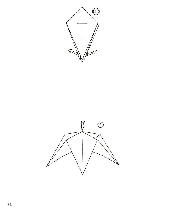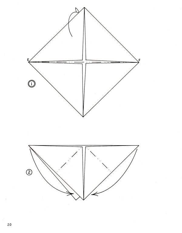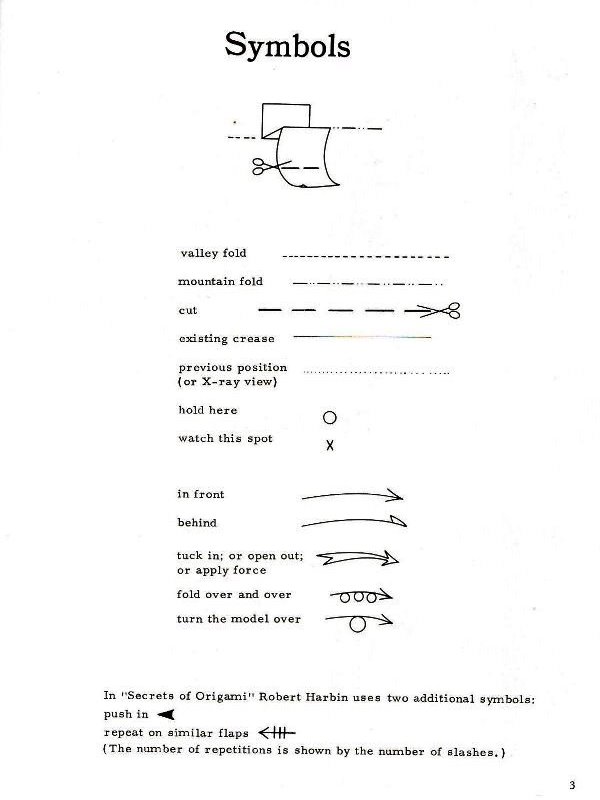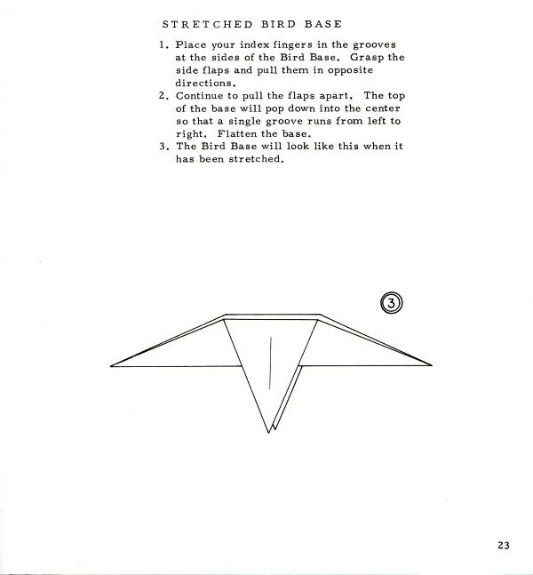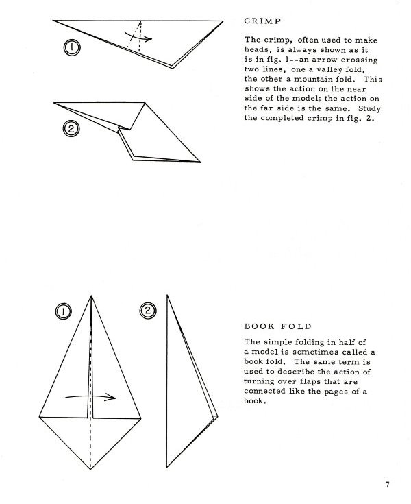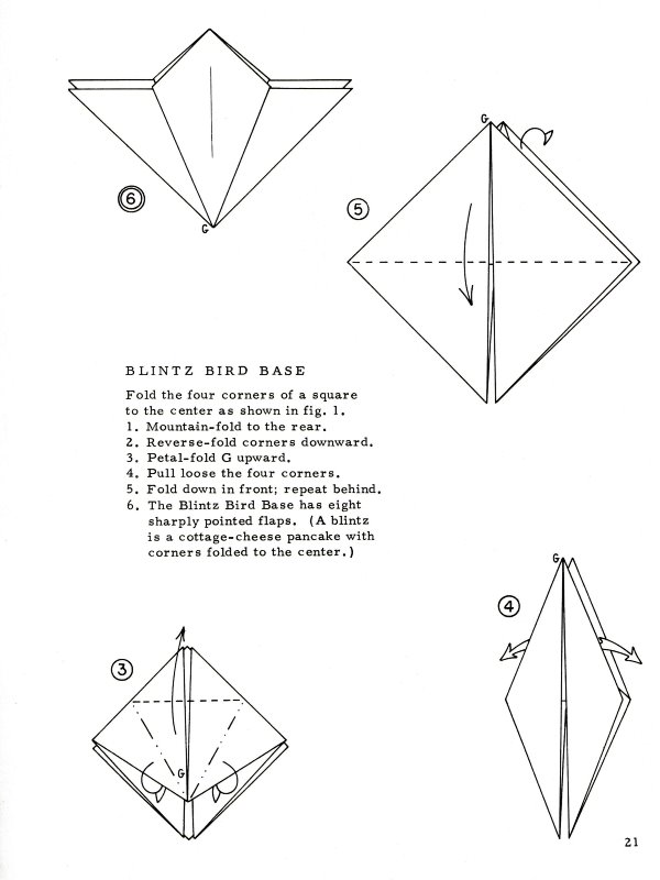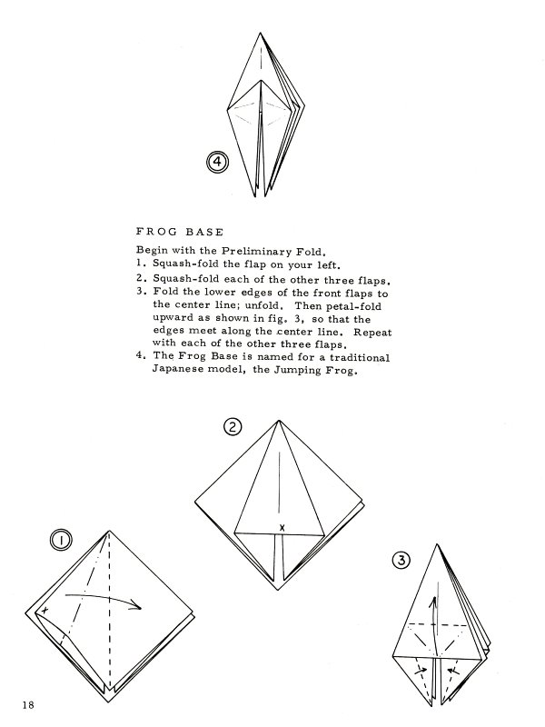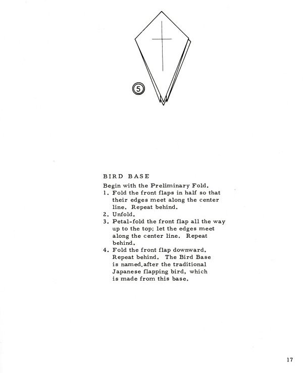 Marshall in Chicago in 1968. There are no diagrams for, or pictures of, paperfolding designs in this work. It sets out a system of standard nomenclature and diagramming symbols for common paperfolding procedures and bases (basic folds) plus ways of making a pentagon and a hexagon with a single cut. (which show that starting from these shapes was still considered a standard part of recreational paperfolding at that time). It is of particular interest because it gives two methods of folding stretched frog bases (the split flap form and the smooth flap form) which are little mentioned ellsewhere. The only blintz base mentioned is the blintzed bird base. ********** ********** ********** |