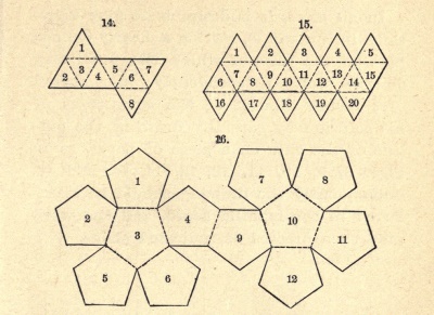 ********** 1876 'Die Formenarbeiten Part 6: Die Papparbeiten' (Cardboard Modelling) by Alois Fellner was published by Wien, A. Pichler's Witwe & Sohn during the years 1874/79. The designs fall into three categories, boxes, polyhedra and life forms (in this case buildings). ********** 1880 'Kleiner Kindergarten' by Karl Schellner, which was published by Alfred Holder in Vienna in 1880, contains a section about 'Das Pappen' which says, inter alia, 'This activity is less suitable for children of pre-school age, but more so for pupils in the upper grades of of elementary and middle school, who are not only supposed to make the boxes necessary for the various teaching materials eg seeds, minerals etc, but also, according to the prescribed curriculum, to produce geometric solids from nets they have drawn themselves.'. ********** 1882 Part Two of 'The Kindergarten Guide' by Maria Kraus Boelte and John Kraus, which was probably first published by E. Steiger and Company in New York in 1882, contains nets for what are termed 'Crystals' but are in fact for various prisms and pyramids, all the Platonic solids, a truncated square-based pyramid, a cone and a cylinder.