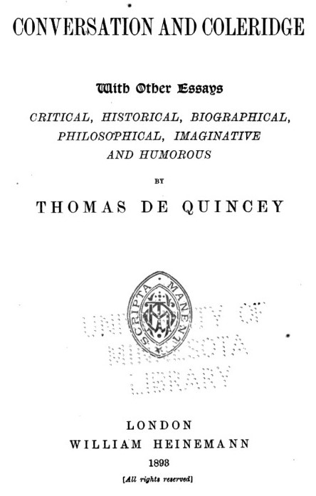Conversation and Coleridge, with other essays, Thomas de Quincey, 1898 | |||||||