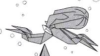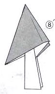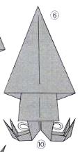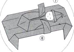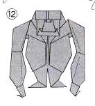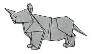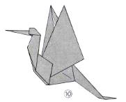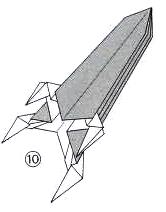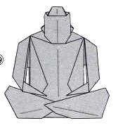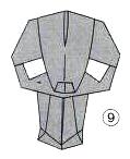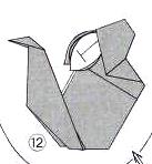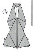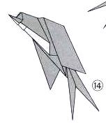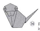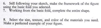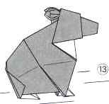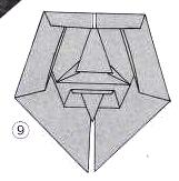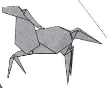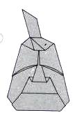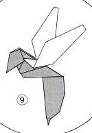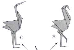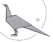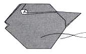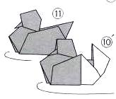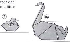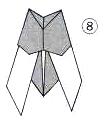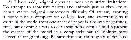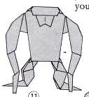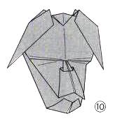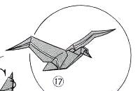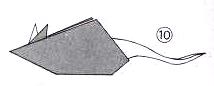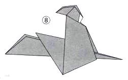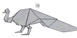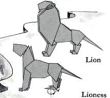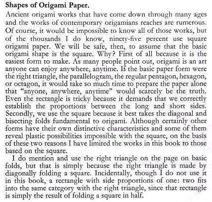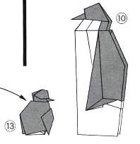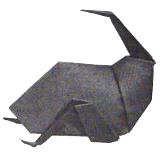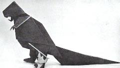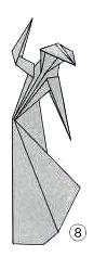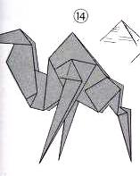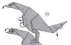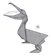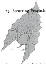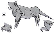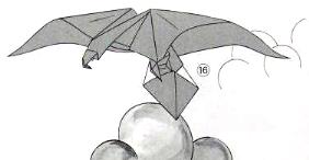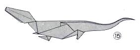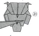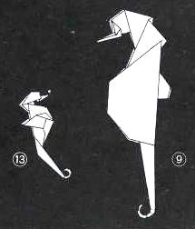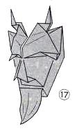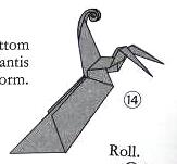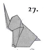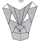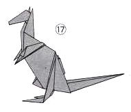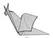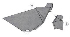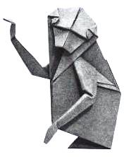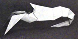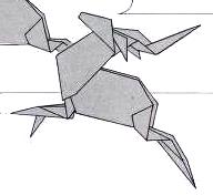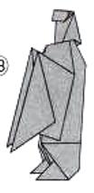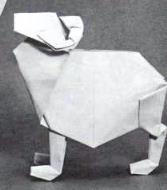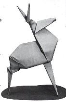 identical. The book consists of diagrams for original designs by the author. Most of the designs are from uncut squares or silver triangles (right angle isosceles triangles) but others are compound designs (some of which require to be glued together) and some few are cut. The book was divided into five sections: Chapter 1: Birds Chapter 2: Animals Chapter 3: Other Fauna and Flora Chapter 4: Masks, People etc Chapter 5: The Thrill of Creating. This chapter sets out Kasahara's creative method and discusses various aspects of paperfolding ethics: *** *** *** *** A full copy of the paperback version of the work can be accessed here. A Spanish translation was published as 'Papiroflexia Creativa' in 1993. A full copy pof this translation can be accessed here. The designs shown in the Analysis are not necessarily in the order in which they appear in the book. Unless otherwise stated all designs are from a single square. ********** Analysis The designs shown here are those which are fully diagrammed in the main body of the work. I have not included designs which are only shown in photographs or are explained in the final chapter of the book. Hen and Chick ********** Swan and Baby Swan ********** Penguin and Baby Penguin ********** Swallow (Cut) The forked tail is created using a cut. ********** Mandarin Ducks ********** Wild Duck (from a silver triangle) ********** Seagull (from a silver triangle) ********** Flying Eagle ********** Stork ********** Flying Pheasant ********** Standing Pheasant *********** Duck ********** Pelican ********** Parakeet (Cut) The crest is created using a cut. ********** Crane and Flamingo ********** Owl ********** Peacock ********** Strutting Peacock (Compound Design from two silver triangles) Only the creases patterns are given. ********** Long-tailed Chicken No folding instructions given. ********** Lyre Bird No folding instructions given. ********** Gamecock No drawing of the finished design is given. ********** Baby Monkey ********** Baby Elephant ********** Snake ********** Squirrel ********** Bear From a blintzed base ********** Mouse (from a silver triangle) ********** Monkey (from a silver triangle) ********** Gorilla (from a silver triangle) ********** Giraffe (three-legged or cut to release the fourth leg) ********** Camel (three-legged) ********** Lizard ********** Deer (seated version) ********** Deer (standing version) A photograph of a standing (presumably three-legged) version is given but the folding method is not explained. ********** Ram (seated version) ********** Ram (standing version) A photograph of a standing (presumably three-legged) version is given but the folding method is not explained. ********** Running Deer (two or three-part compound design assembled without glue). The antlers are made from either a single quarter size square or two eighth size silver triangles. ********** Lion and Lioness (compound designs) In both cases the rear legs are made from quarter size squares. ********** Chimpanzee ********** Tyrannosaur ********** Kangaroo ********** Bull (glued compound design) The rear legs are made from a second, quarter size, square. ********** Tiger (glued compound design) The rear legs are made from a second, quarter size, square. ********** Rhinocerous (glued compound design) The rear legs are made from a second, quarter size, square. ********** Horse (glued compound design) From two bird bases. ********** Dragon (glued compound design) The front and back legs are made from two squares of the same size. The head is made from a third, quarter size, square. ********** Locust - a version of the Kabuto Base Cicada made from a silver triangle. ********** Grasshopper - made from a silver triangle. ********** Rhinocerous Beetle - made from a silver triangle. ********** Dragonfly - made from a silver triangle. ********** Bee - made from a silver triangle. ********** Ant (Cut) - made from a silver triangle. A cut is used to create the antennae. ********** Praying Mantis - made from a silver triangle. ********** Crawfish - made from a silver triangle. ********** Goldfish - made from a silver triangle. ********** Shark ********** Blowfish (Cut) A cut is uded to create 'a cute mouth'. ********** Daddy and Baby Seahorse ********** Whale ********** Flower in a Vase (multiple sheet design) ********** Tulip (glued multiple sheet design) ********** Pansy (multiple sheet design wired together) ********** Rose ********** Butterfly ********** Snail ********** Chrysanthemum / Gentian ********** Sunflower ********** Crab ********** Octopus ********** Squid (two-part compound design) ********** Indian ********** Mephistopheles ********** Skull Mask ********** One-Eyed Pirate ********** Sheikh ********** Viking Helmet Add to Sheikh to create a Viking Warrior ********** Witch ********** Moses (three -part compound figure - body / staff / beard) ********** Sphinx ********** Pyramid ********** Shepherd ********** Tree in Full Foliage