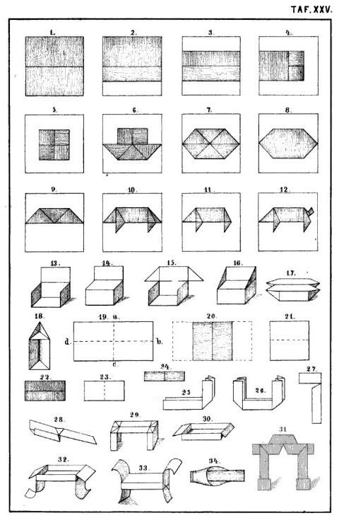 ********** In Western Europe / the USA 1863 The method of making Koehler's Groundform by folding in the two sets of opposite sides in turn is described in 'Katechismus der praktischen Kindergärtnerei' by Friedrich Seidel, which was published by J J Weber in Leipzig in 1863. The text says: 'Folding the sides open and closed is continued, etc, and Erkennnisformen, Schonnheitsformen and Lebensformen appear in abundance.' The Pig is shown as an example. Paragraph 249 states: 'Until now kindergartens have only known the first folding rule (ie blintzing the square): the second is a more recent invention by A Koehler.'